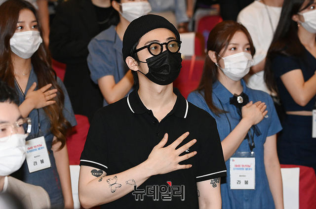 래퍼 기리보이가 17일 오후 국회 의원회관에서 열린 제4회 청년의날 조직위원회 발대식에서 국민의례를 하고 있다.