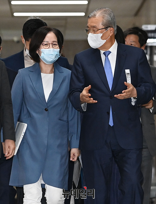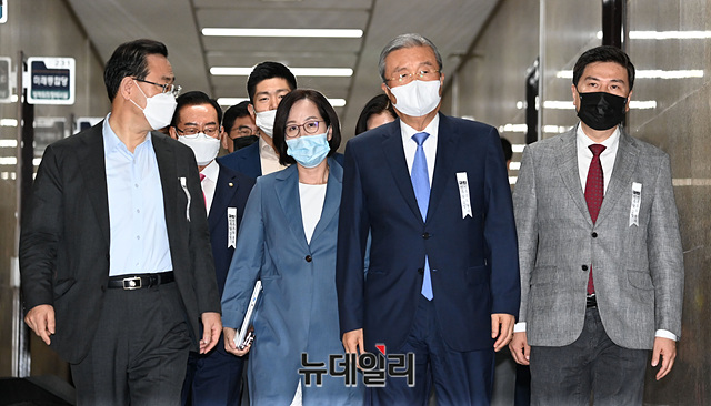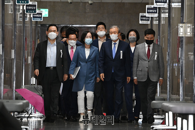 김종인 미래통합당 비상대책위원장, 주호영 원내대표, 김현아 위원 등 참석자들이 20일 오전 국회에서 열린 비상대책위원회에 입장하고 있다.