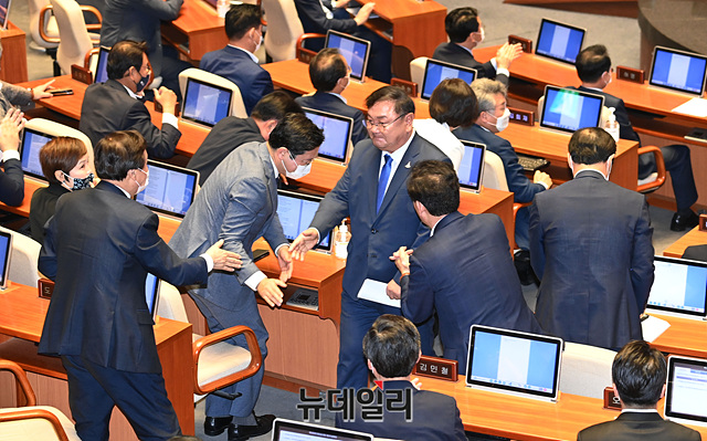[포토] 동료의원 박수 받으며 본회의장 나서는 김태년