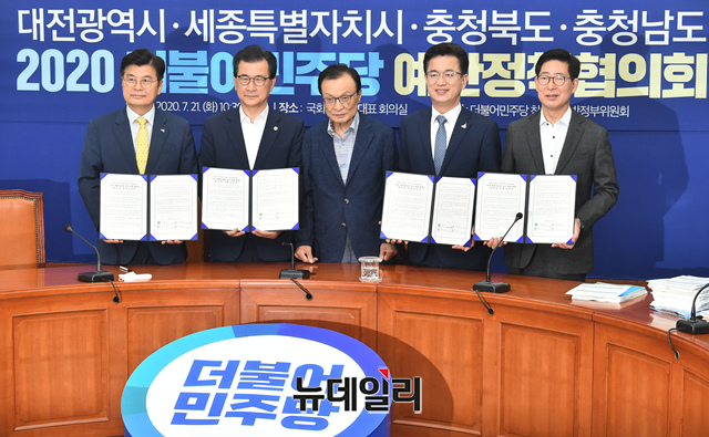 이춘희 세종시장, 이시종 충북지사, 이해찬 더불어민주당 대표, 허태정 대전시장, 양승조 충남지사가 21일 오전 국회에서 열린 충청권 예산정책협의회서 행정수도 완성 지지 표명 환영 충청권 공동선언문에 서명을 마친 후 기념촬영 하고 있다.