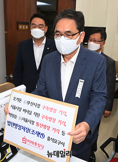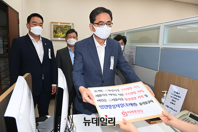 곽상도·조수진·정희용 미래통합당 의원이 21일 오전 국회 의안과에 오거돈 전 부산시장 구속영장 기각, 서울시장 비서실 직원, 박원순 전 서울시장 통신영장 기각 관련 조재연 법원행정처장 출석요구서를 제출하고 있다.