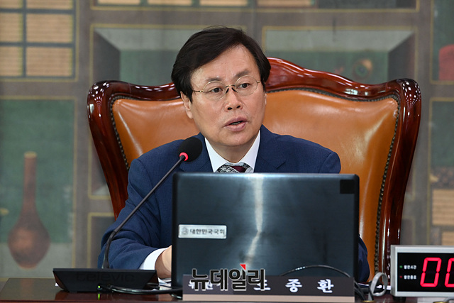 도종환 국회 문화체육관광위원장이 21일 오전 국회에서 열린 문체위 전체회의에서 발언을 하고 있다.
