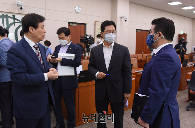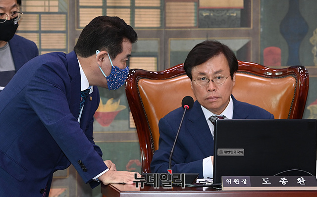 도종환 국회 문화체육관광위원장과 박정 더불어민주당 간사가 21일 오전 국회에서 열린 문체위 전체회의에서 대화를 나누 고 있다.
