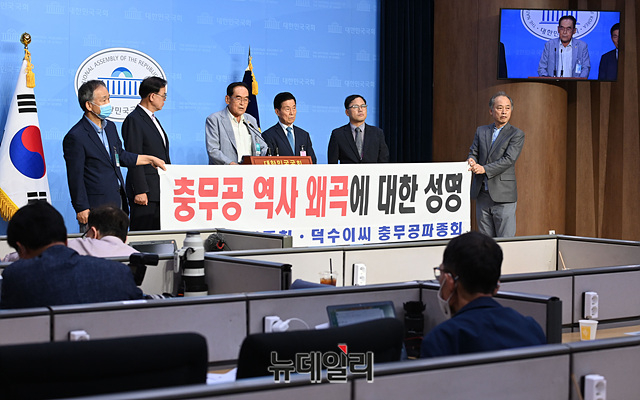 이명수 미래통합당 의원 등 참석자들이 21일 오후 국회 소통관 기자회견장에서 이순신 장군 관노 관련 허위사실 유포 사과 촉구 기자회견을 갖고 있다.