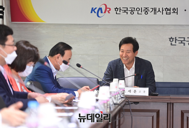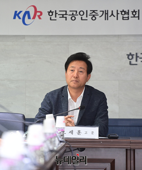 오세훈 전 서울시장이 21일 오후 서울 관악구 한국공인중개사협회 회관에서 열린 미래통합당 부동산시장 정상화 특위 현장간담회에서 인사말을 하고 있다.현장간담회에는 송석준 위원장, 오세훈 고문, 정경희, 윤창현, 김형동, 하영재 통합당 의원, 정재호 교수, 이종인 여의도연구원 실장과 박용현 공인중개사협회장, 송웅섭, 김성제, 이영태 지부장, 허준, 박종성 대의원, 차준근 회원 등이 참석했다.현장간담회 직후 현장 공인중개사 사무소와 주거현장을 방문할 예정이다.