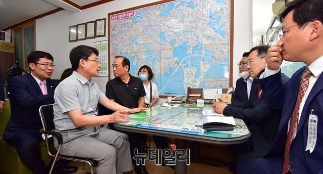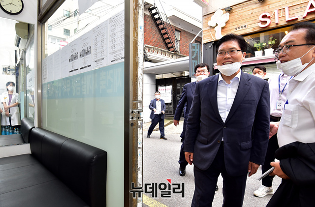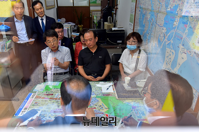 송석준 미래통합당 부동산시장 정상화 특별위원장과 소속 국회의원, 박용현 한국공인중개사협회장이 21일 오후 서울 관악구의 한 공인중개사를 찾아 주민과 대화를 나누고 있다.