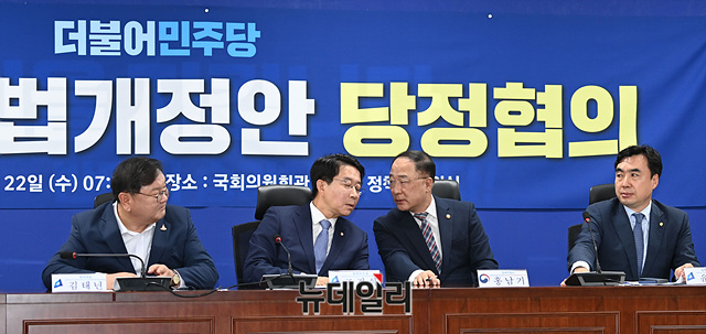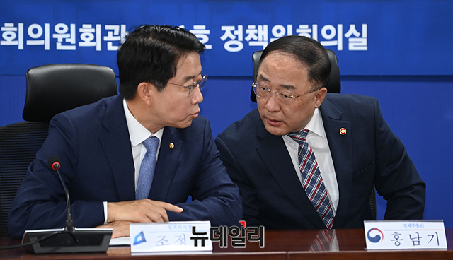 홍남기 경제부총리 겸 기획재정부 장관이 22일 오전 국회에서 열린 2020년 세법개정안 당정협의에서 조정식 정책위의장과 대화를 하고 있다.