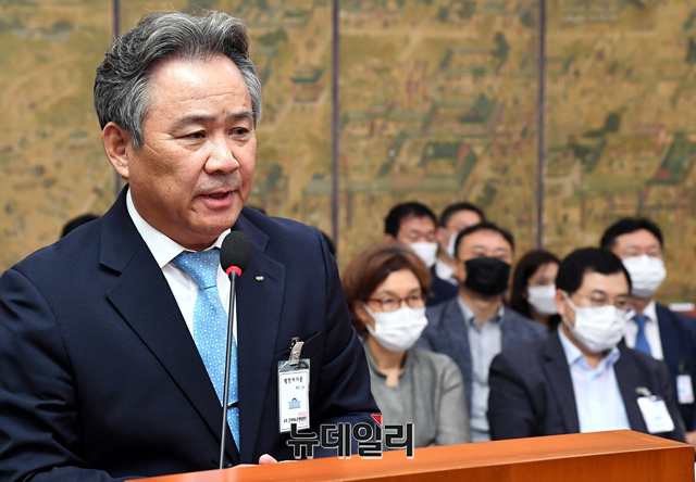 이기흥 대한체육회장이 22일 국회에서 열린 '철인 3종경기 선수 가혹행위 및 체육분야 인권침해에 대한 청문회'에 출석해 발언을 하고 있다.