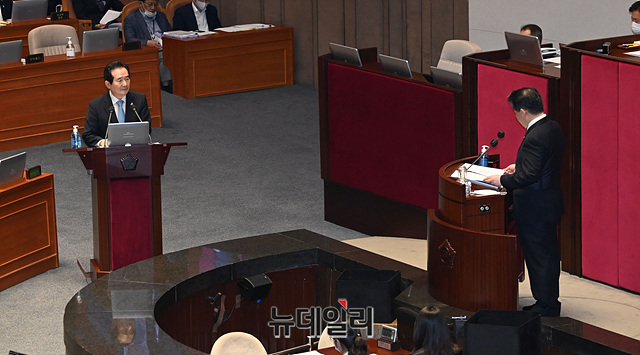 정세균 국무총리가 22일 오후 국회 본회의장에서 열린 제380회국회(임시회) 제4차 본회의 정치·외교·통일·안보 분야 대정부질문에서 김경협 더불어민주당 의원의 질의에 답하고 있다.