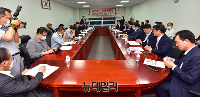 '교원의 지위와 전문성 향상을 위한 입법토론회' 참석자들이 22일 오후 국회 의원회관에서 열린 토론회에서 기념촬영을 하고 있다.