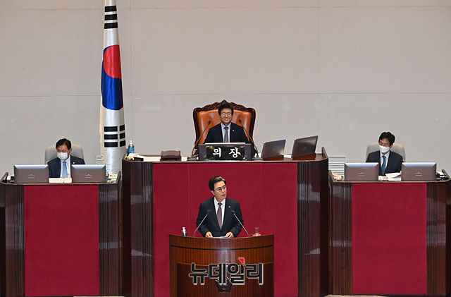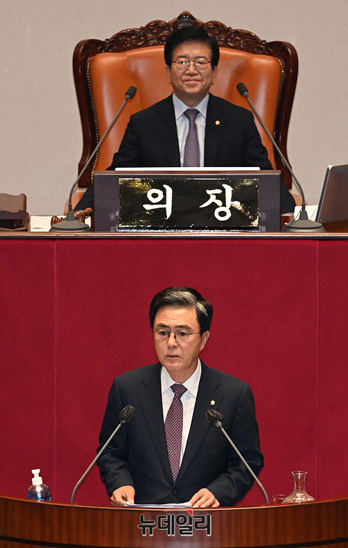 김태흠 미래통합당 의원이 22일 오후 국회 본회의장에서 열린 제380회국회(임시회) 제4차 본회의 정치·외교·통일·안보 분야 대정부질문을 하고 있다.