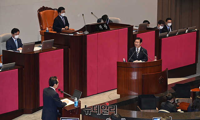 박범계 더불어민주당 의원이 22일 오후 국회 본회의장에서 열린 제380회국회(임시회) 제4차 본회의 정치·외교·통일·안보 분야 대정부질문을 하고 있다.