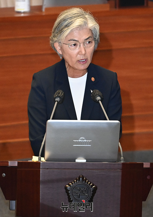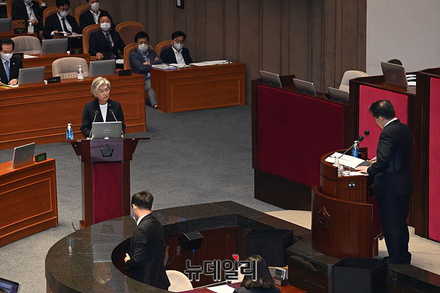 강경화 외부부 장관이 22일 오후 국회 본회의장에서 열린 제380회국회(임시회) 제4차 본회의 정치·외교·통일·안보 분야 대정부질문에 답하고 있다.