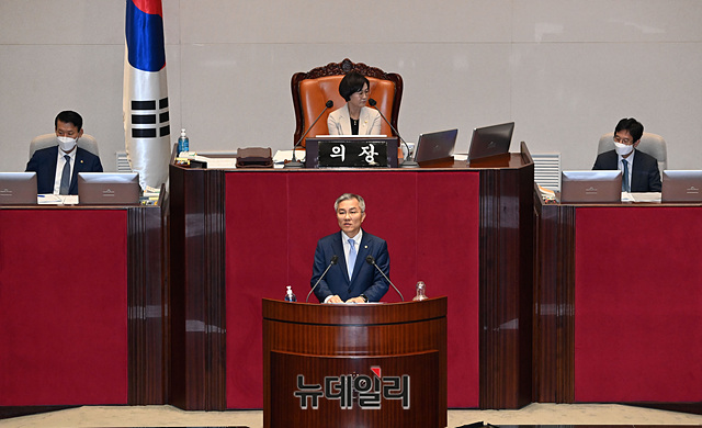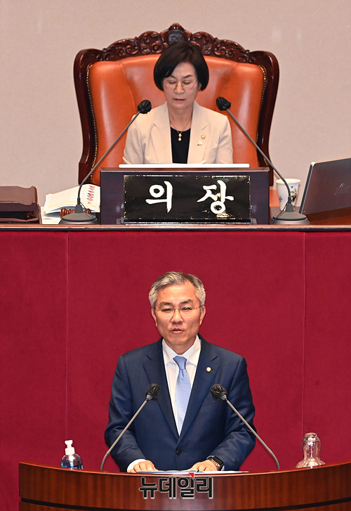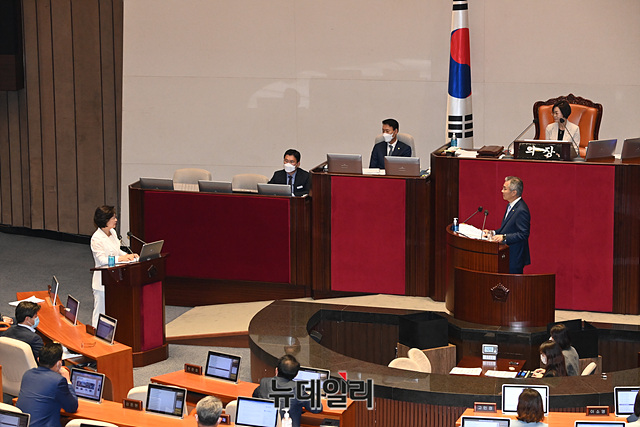 최강욱 열린민주당 의원이 22일 오후 국회 본회의장에서 열린 제380회국회(임시회) 제4차 본회의 정치·외교·통일·안보 분야 대정부질문을 하고 있다.