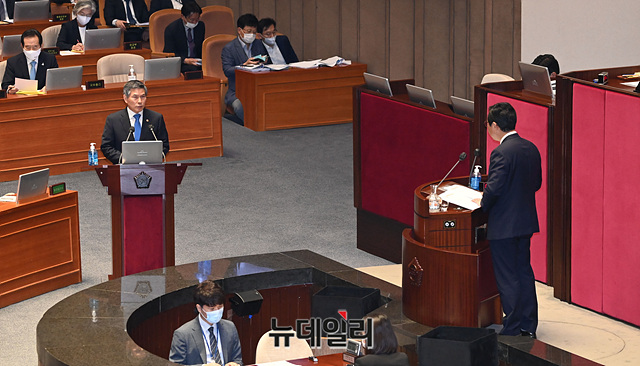 정경두 국방부 장관이 22일 오후 국회 본회의장에서 열린 제380회국회(임시회) 제4차 본회의 정치·외교·통일·안보 분야 대정부질문에서 김한정 더불어민주당 의원의 질의에 답하고 있다.