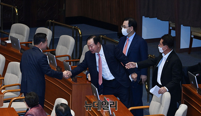 [포토] 대정부 질문 마친 뒤 동료 의원 인사받는 신원식
