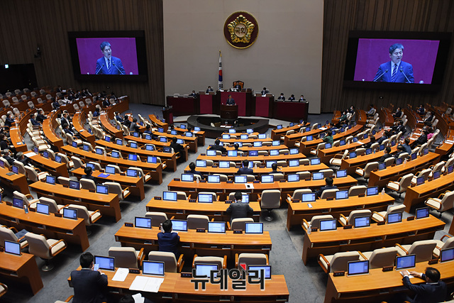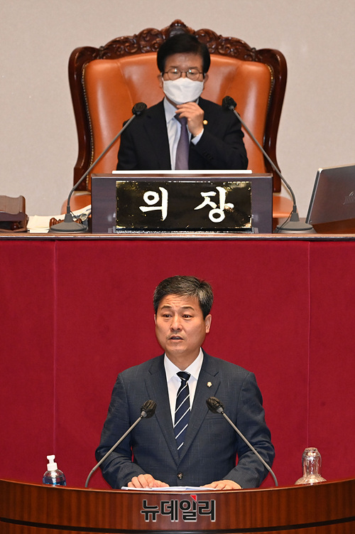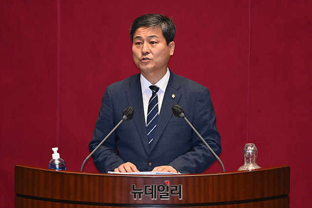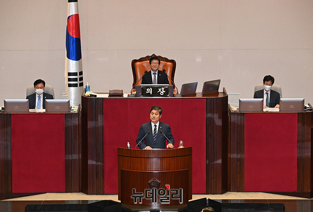 김영배 더불어민주당 의원이 22일 오후 국회 본회의장에서 열린 제380회국회(임시회) 제4차 본회의 정치·외교·통일·안보 분야 대정부질문을 하고 있다.