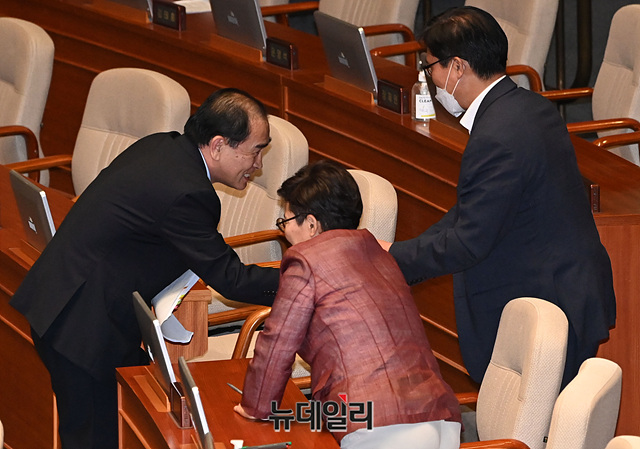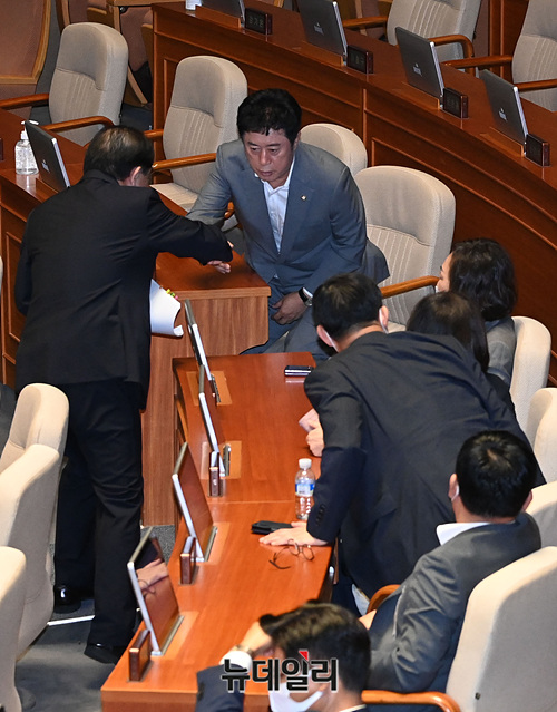 [포토] 대정부질문 직후 동료의원 인사받는 태영호