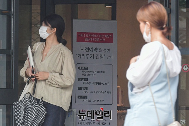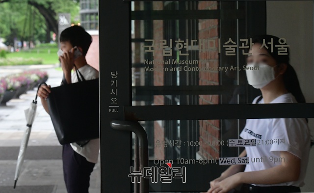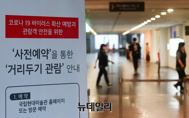 서울 종로구 국립현대미술관에 22일 오후 사전예약 안내문이 붙어있다. 국립현대미술관은 홈페이지나 방문을 통해 사전예약으로 운영한다. 시간당 입장 인원수를 제한해 '거리두기 관람'을 진행한다.서울시는 22일 '코로나19(중국 우한 폐렴)’로 휴관했던 수도권 내 박물관, 미술관, 왕릉 등 66개 문화시설들을 55일만에 재개관 했다.서울시는 "시설별 특성에 따라 사전예약제나 입장인원 제한 등 단계적으로 문화시설 운영을 재개하고 방역지침을 준수해 안전하게 운영할 계획"이라 밝혔다.