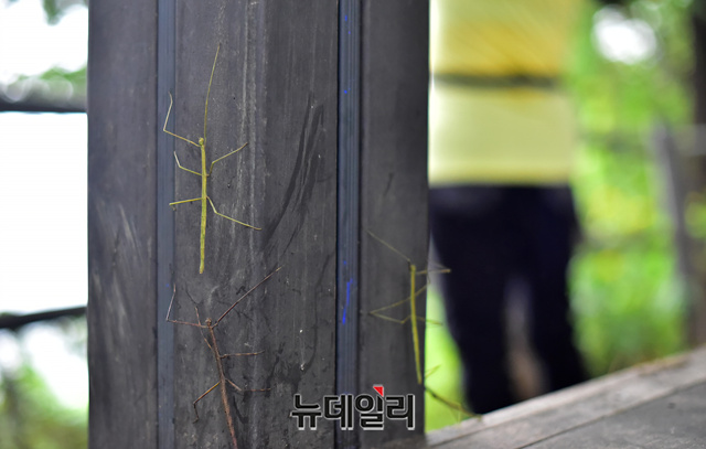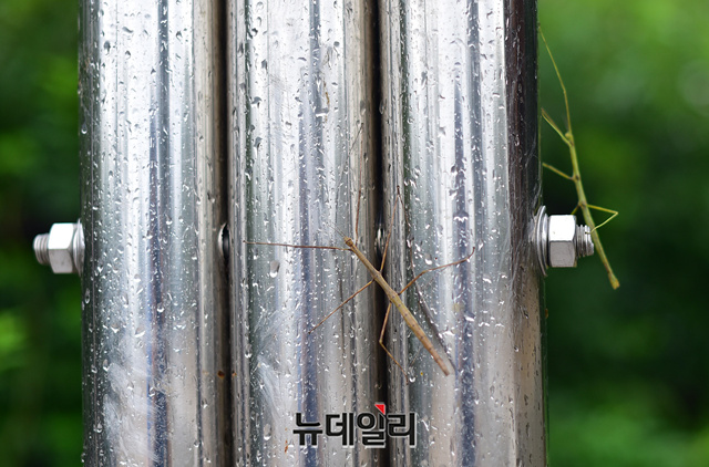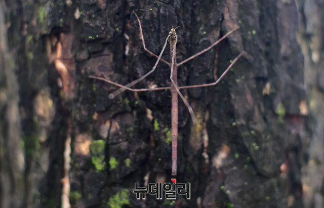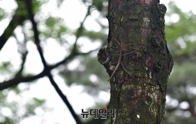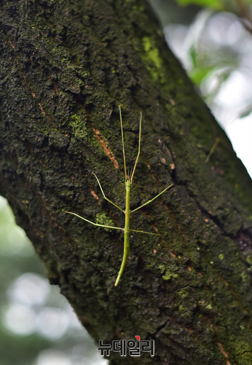 나무가지 모양의 대벌레가 22일 서울 은평구 봉산 일대에서 대규모로 출몰해 주민들의 민원이 이어지고 있다.봉산 입구에는 '대벌레 방제를 지속적으로 실시한다'는 현수막도 걸렸다.대벌레는 산 정상으로 갈 수록 많이 발견된다. 등산로에는 방제작업으로 죽은 대벌레를 쉽게 발견할 수 있다.대벌레는 주민들이 자주 이용하는 팔각정 쉼터나 운동기구에 붙어 주민들이 불편을 호소하기도 했다.김미경 은평구청장은 21일 환경부 장관과 만나 '환경개선 부담금'의 지방자치단체 배분 비율을 높여 달라고 건의했다.