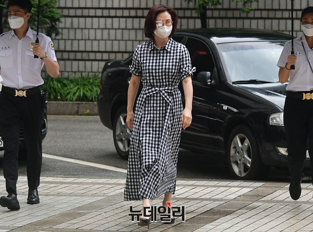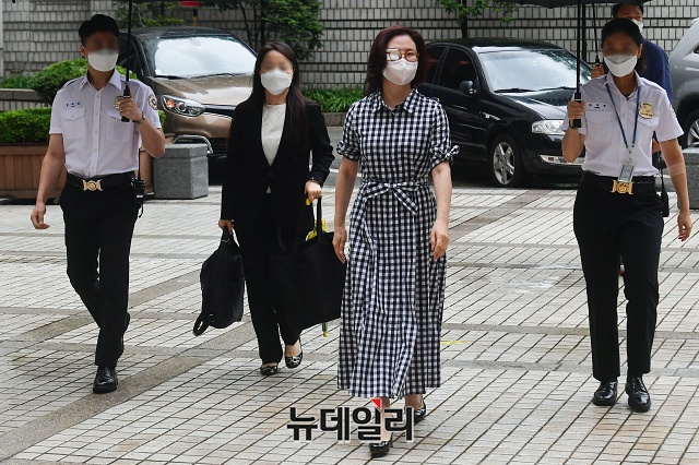 조국 전 법무부 장관 부인 정경심 교수가 23일 오전 서울 서초구 서울중앙지법으로 출석하고 있다. 정 교수는 자녀 입시비리와 사모펀드 의혹 등 14개 혐의로 기소됐다.