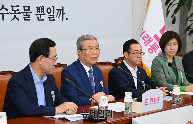 김태년 더불어민주당 원내대표가 23일 오전 국회에서 열린 정책조정회의에서 모두발언을 하고 있다. 이날 통합당 백보드에는 최근 수도권에서 발생한 수돗물 유충 발견 사태를 비판하는 '이 나라, 믿을 수 없는게 수돗물 뿐일까'라는 글이 적혀있다.