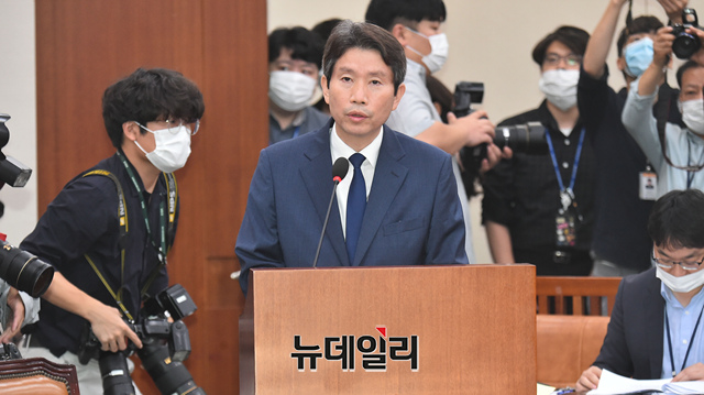 이인영 통일부 장관 후보자가 23일 오전 국회에서 열린 외교통일위원회의 국무위원후보자 인사청문회에 출석해 모두발언을 하고 있다.