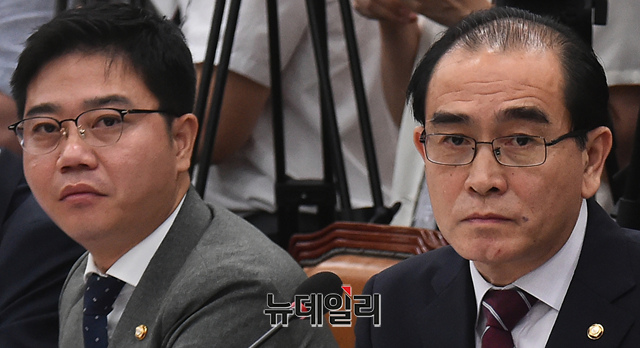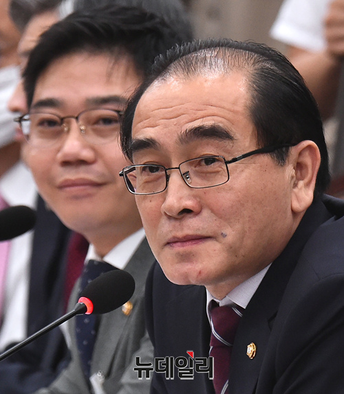 태영호·지성호 미래통합당 의원 23일 오전 국회에서 열린 이인영 통일부 장관 후보자 인사청문회에 참석해 회의를 지켜보고 있다.이날 태 의원이 전대협(전국대학생대표자협의회) 의장 출신인 이 후보자를 향해 "언제 어디서 주체사상을 버렸다, 신봉자가 아니라고 한 적이 있냐?"며 "후보자 삶의 궤적을 보니 언제 사상을 전향했는지 못 찾겠다"고 질문하자 이 후보자는 "남쪽에서는 사상의 자유가 사회적으로 강요되지 않는다"고 답했다.전대협은 산하 정책위원회가 주한미군 철수, 국가보안법 철폐, 평화협정 체결, 연방제 통일 등을 주장해 1992년 대법원에서 이적단체로 확정됐다.