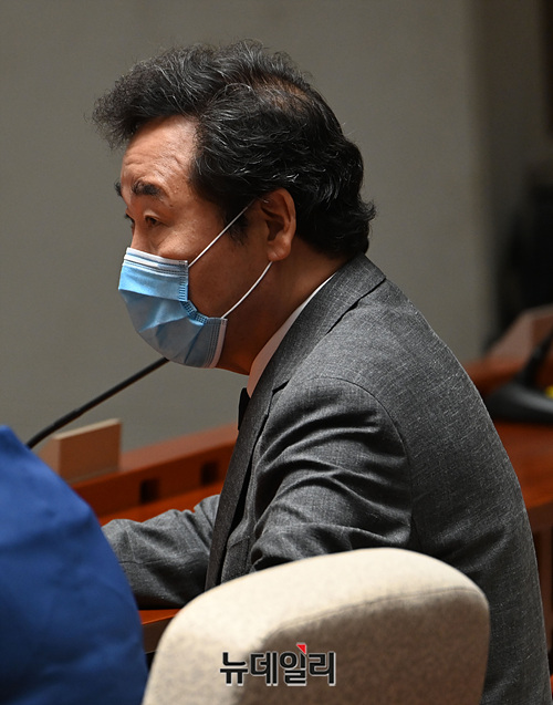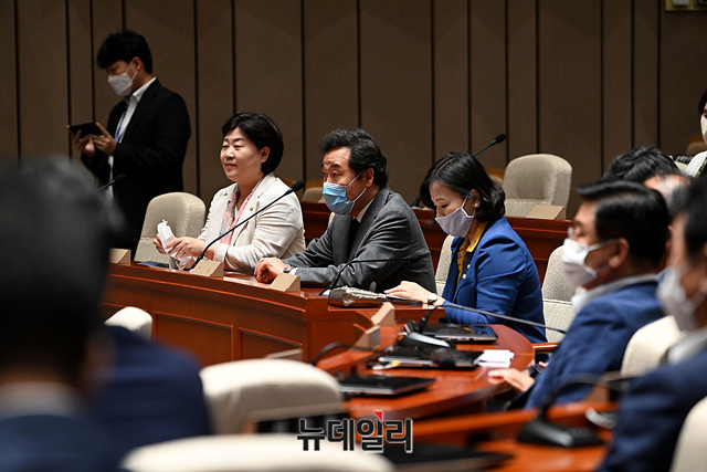 이낙연 더불어민주당 의원이 23일 오후 국회에서 열린 의원총회에 참석해 자리하고 있다.