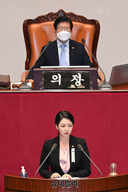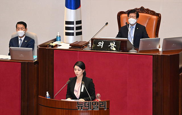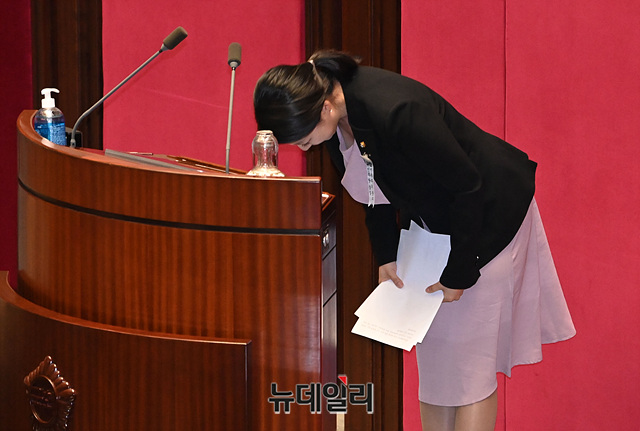 배현진 미래통합당 의원이 23일 국회 본회의장에서 열린 제380회국회(임시회) 제5차 본회의에서 추미애 법무부 장관 탄핵소추안 관련 제안설명을 하고 있다.