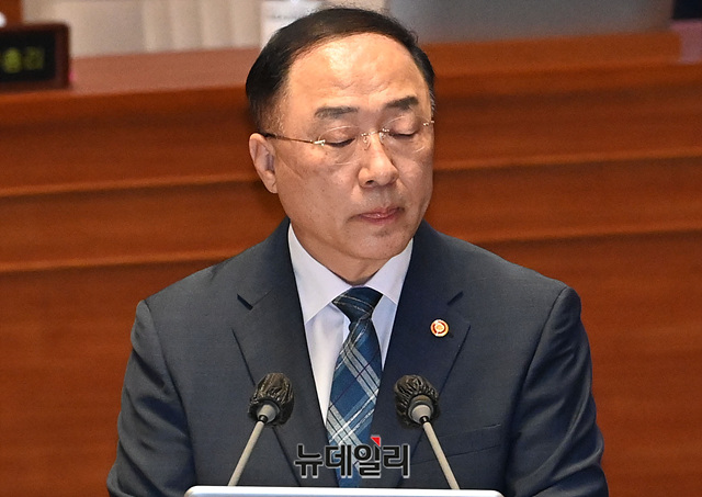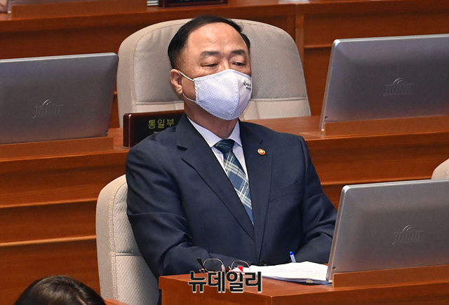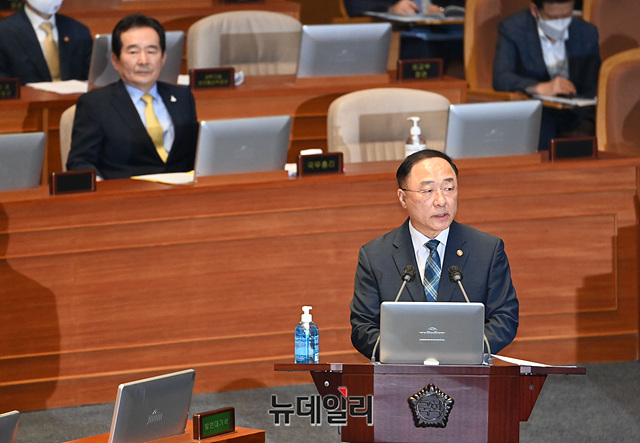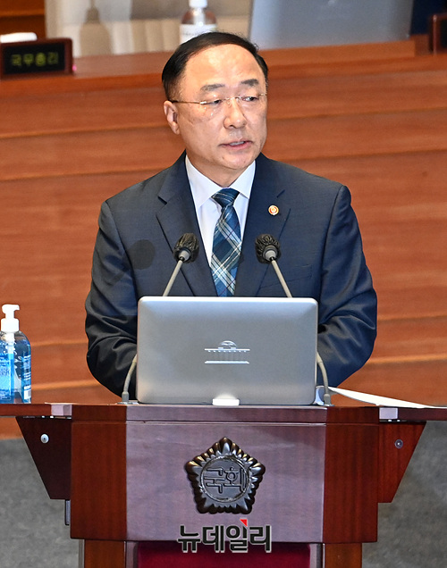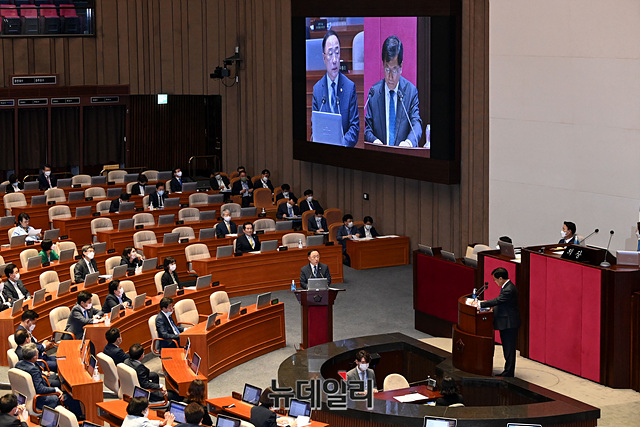 홍남기 경제부총리 겸 기획재정부 장관이 23일 오후 국회 본회의장에서 열린 제380회국회(임시회) 제5차 본회의 경제 분야 대정부질문에서 의원들의 질의에 답하고 있다.