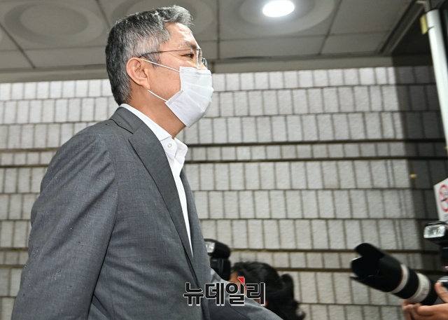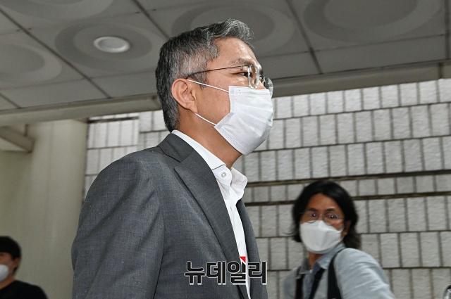 최강욱 열린민주당 대표가 23일 오후 서울 서초구 서울중앙지법으로 출석하고 있다. 최 대표는 변호사 시절 조국 전 법무부 장관 아들에게 로펌 인턴증명서를 허위 발급한 혐의를 받고 있다.
