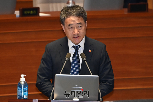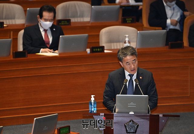 박능후 보건복지부 장관이 24일 오후 국회 본회의장에서 열린 제380회 국회(임시회) 제6차 본회의 교육·사회·문화 분야 대정부질문에서 한정애 더불어민주당 의원의 질의에 답하고 있다.