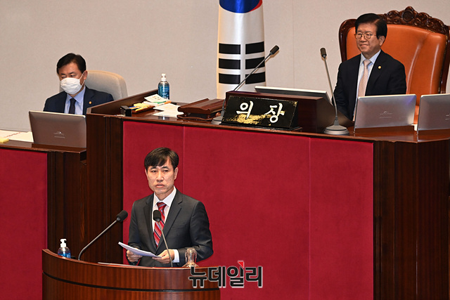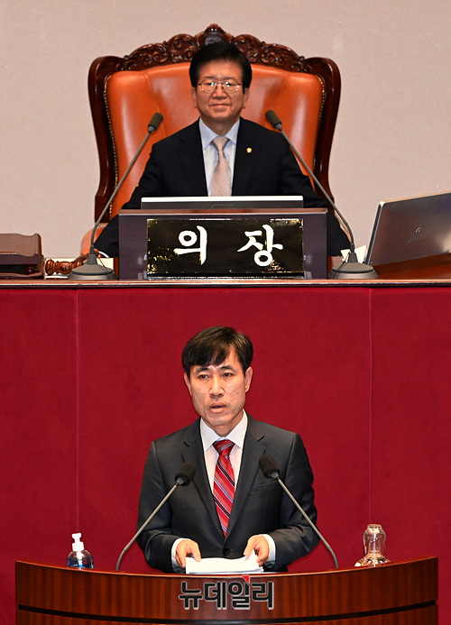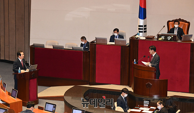 하태경 미래통합당 의원이 24일 오후 국회 본회의장에서 열린 제380회 국회(임시회) 제6차 본회의에서 교육·사회·문화 분야 대정부질문을 하고 있다.