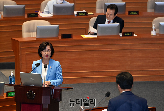 추미애 법무부 장관이 24일 오후 국회 본회의장에서 열린 제380회 국회(임시회) 제6차 본회의 교육·사회·문화 분야 대정부질문에서 의원들의 질의에 답하고 있다.