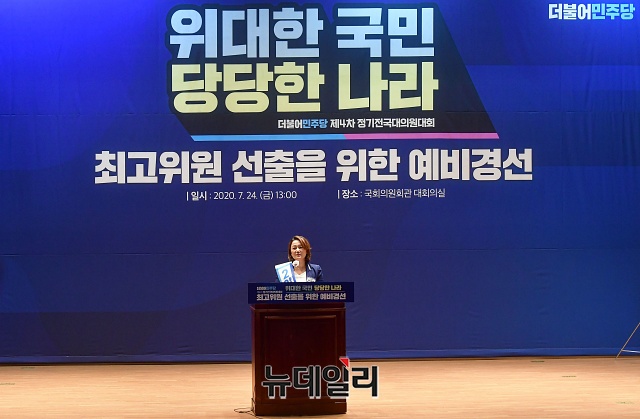 이재정 최고위원 후보가 24일 오후 국회 의원회관에서 열린 '더불어민주당 최고위원 선출을 위한 예비경선'에서 정견발표를 하고 있다.