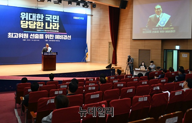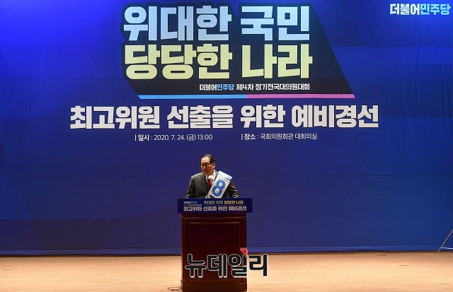정광일 더불어민주당 최고위원 후보가 24일 오후 국회 의원회관에서 열린 예비경선에서 정견발표를 하고 있다.