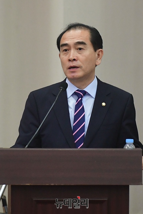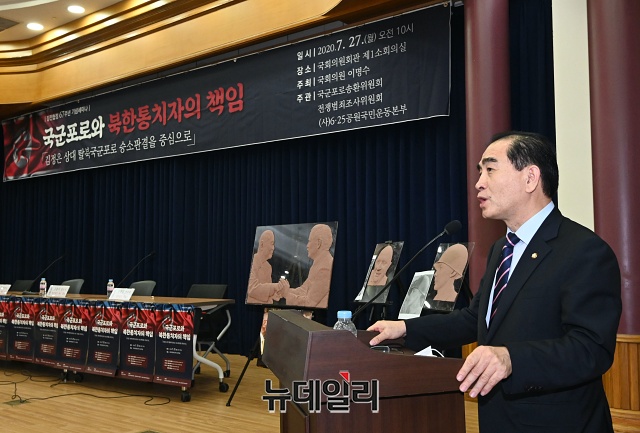 태영호 미래통합당 의원이 27일 오전 국회 의원회관에서 열린 정전협정 67주년 기념 세미나에서 축사를 하고 있다.