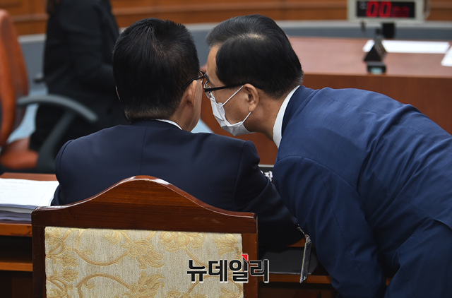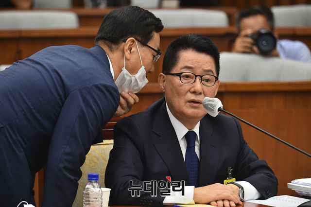 박지원 국가정보원장 후보자가 27일 오전 국회에서 열린 정보위원회 인사청문회에 출석해 보좌진과 대화를 나누고 있다.