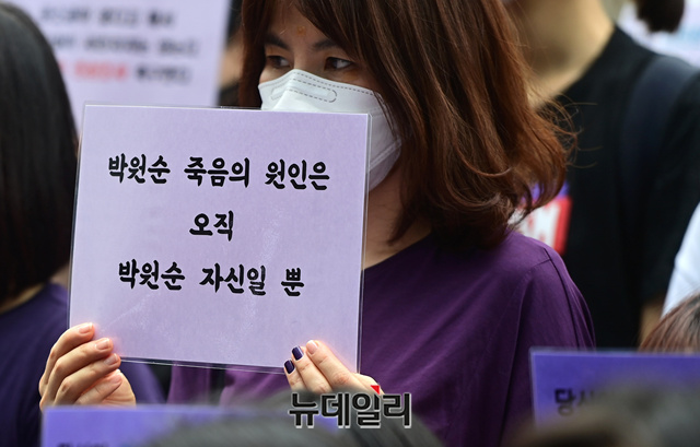 한국성폭력상담소, 한국여성의전화 등 여성시민단체가 28일 오전 서울 중구 국가인권위원회 앞에서 '고 박원순 전 서울시장에 의한 위력 성폭력 사건'과 관련해 국가인권위의 직권조사를 촉구하는 기자회견을 갖고 있다.