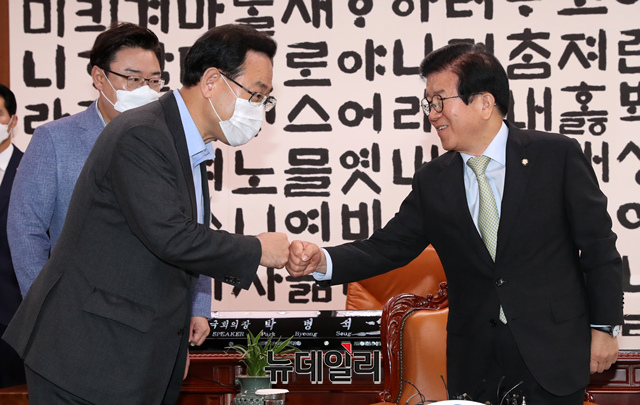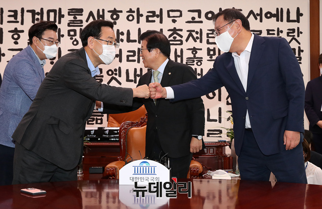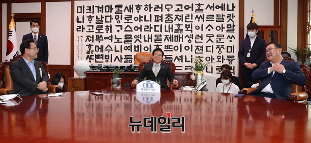 박병석 국회의장과 여야 원내대표가 28일 오전 국회 의장실에서 정례회동을 갖고 있다. (왼쪽부터 주호영 미래통합당 원내대표, 박병석 국회의장, 김태년 더불어민주당 원내대표)