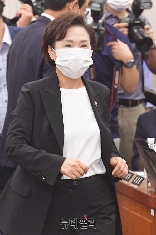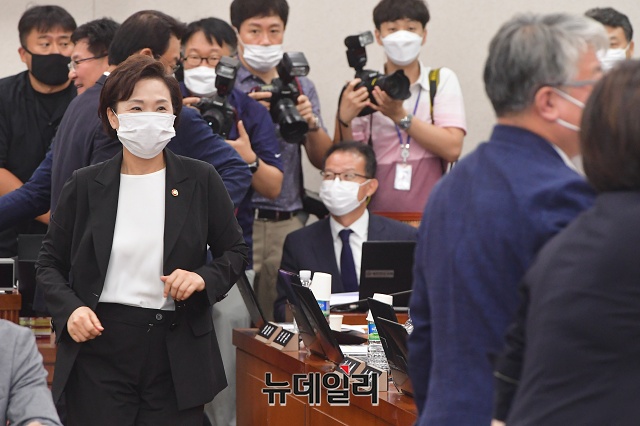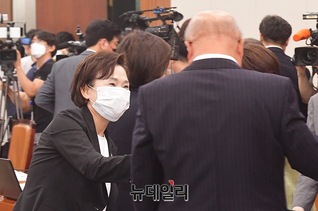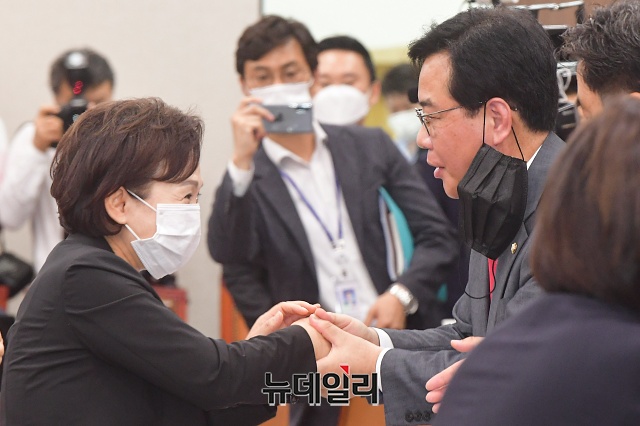 김현미 국토부 장관이 28일 오전 국회에서 열린 국토교통위원회 전체회의 정회 후 참석자들과 인사하고 있다.