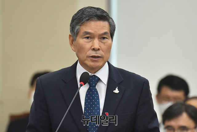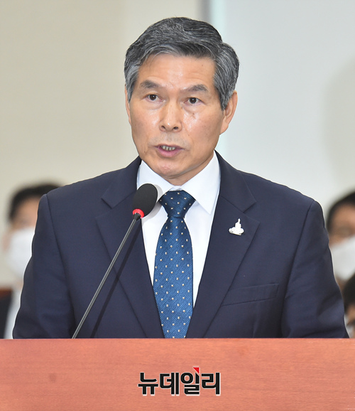 정경두 국방부 장관이 28일 오전 국회에서 열린 국방위원회 전체회의에서 참석해 업무보고를 하고 있다.