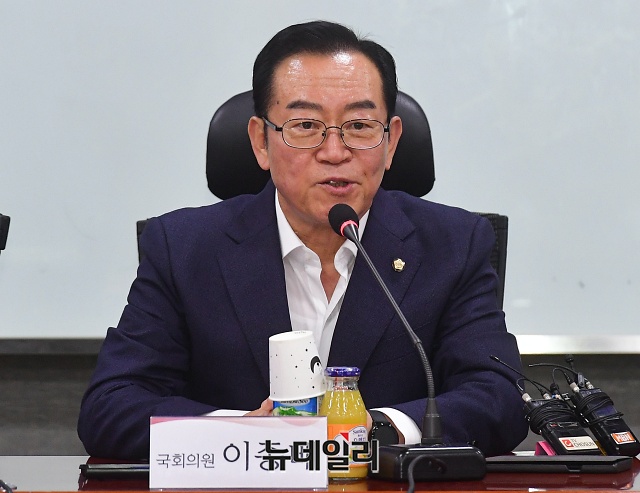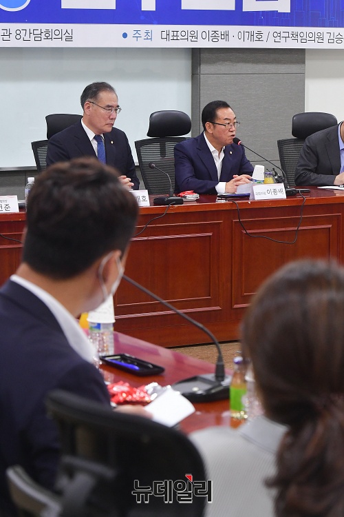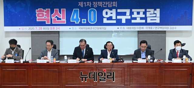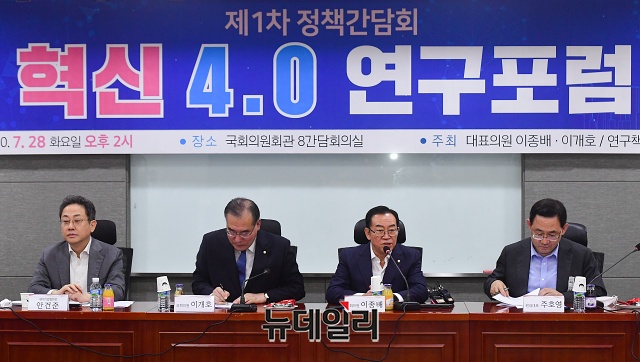 이종배 미래통합당 정책위의장이 28일 오후 국회 의원회관에서 열린 '혁신 4.0 연구포럼' 정책간담회에서 개회사를 하고 있다. 포럼에는 고경모 유진투자증권 대표, 안건준 벤처기업협회장이 발제를 맡았다.