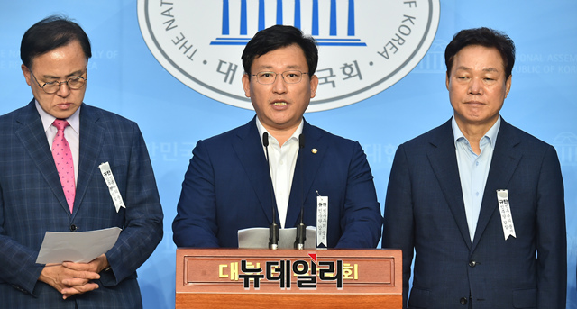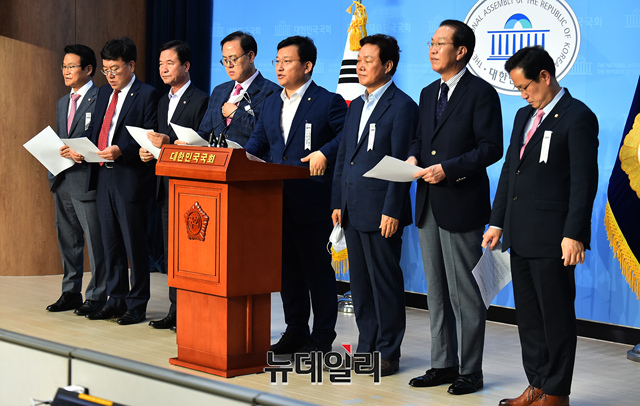 행정안전위원회 소속 박완수 미래통합당 간사, 권영세, 김용판, 박수영 의원 등 소속 위원들이 28일 오후 국회 소통관 기자회견장에서 부동산세와 관련 지방세법 개정안을 더불어민주당이 강행했다며 규탄 기자회견을 갖고 있다.