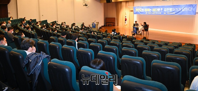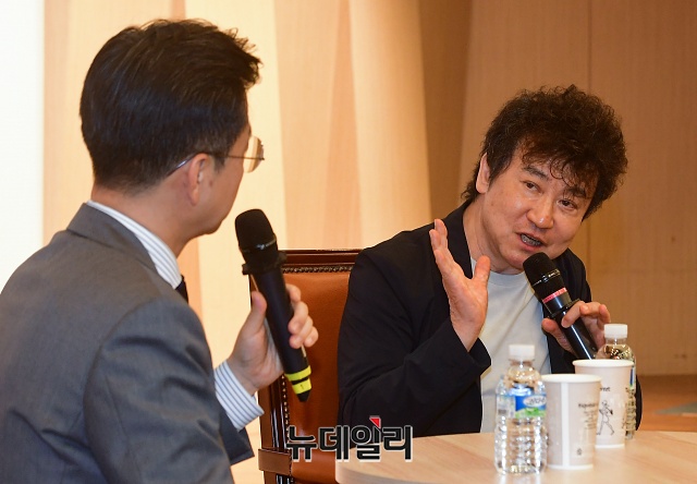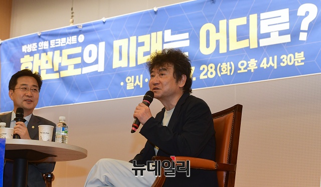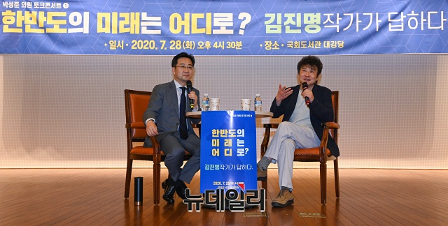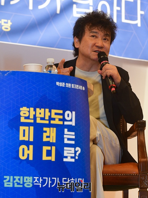 김진명 작가가 28일 오후 국회도서관에서 열린 '한반도의 미래는 어디로? 김진명 작가가 답하다' 토크콘서트에서 인사말을 하고 있다.