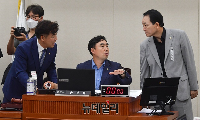 윤관석 국회 정무위원회 위원장, 김병욱 더불어민주당 간사, 성일종 미래통합당 간사가 29일 오전 국회에서 열린 정무위원회 전체회의에서 대화를 나누고 있다.