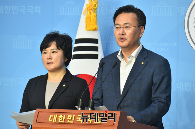 법사위 소속 미래통합당 유상범·조수진 의원이 29일 오후 국회 소통관에서 한동훈 검사장에 대한 정진웅 부장검사의 독직폭행 사건과 관련해 기자회견을 갖고 있다.