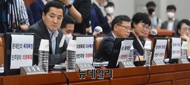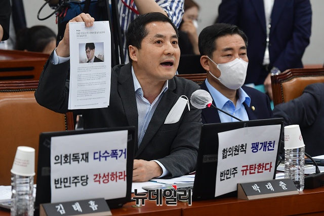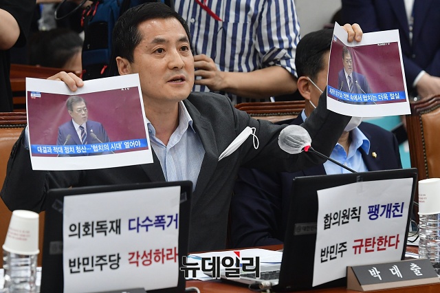 박대출 미래통합당 의원이 29일 오후 국회에서 열린 운영위원회 전체회의에서 한동훈 검사장 관련 기사를 보여주며 항의발언하고 있다.