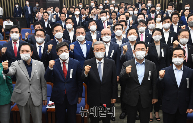김종인 미래통합당 비상대책위원장과 주호영 원내대표 등 소속 의원들이 30일 오전 국회에서 열린 의원총회에서 정부 여당 규탄 구호를 외치고 있다.